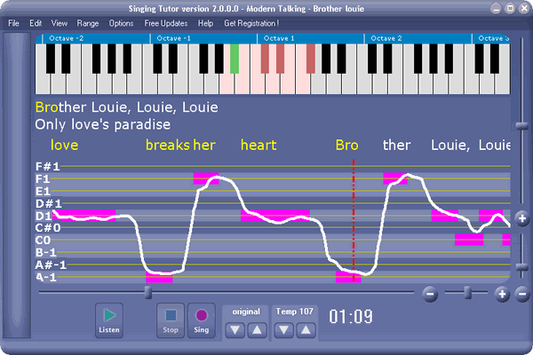 Open MID (midi) or KAR (karaoke) file by chousing “File – Open Midi” you will see rectangular note pitches. Use Sliding controls and Select melody track option to see them. You can sing with midi and check your voice tone by midi pitches. Change song tempo, slide midi notes up and down (make it for tenor or bass singer). If lyrics present in the midi file, it shown on the top. You can hide them using View options.